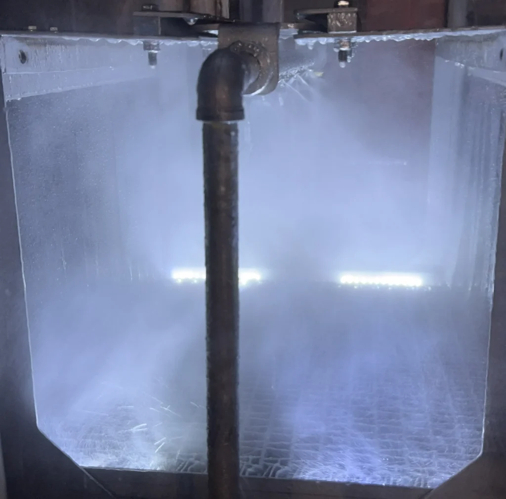 A mist collector condenses steam and returns it to the wash tank. Air passes through a combination of filters and is exhausted back into the plant.