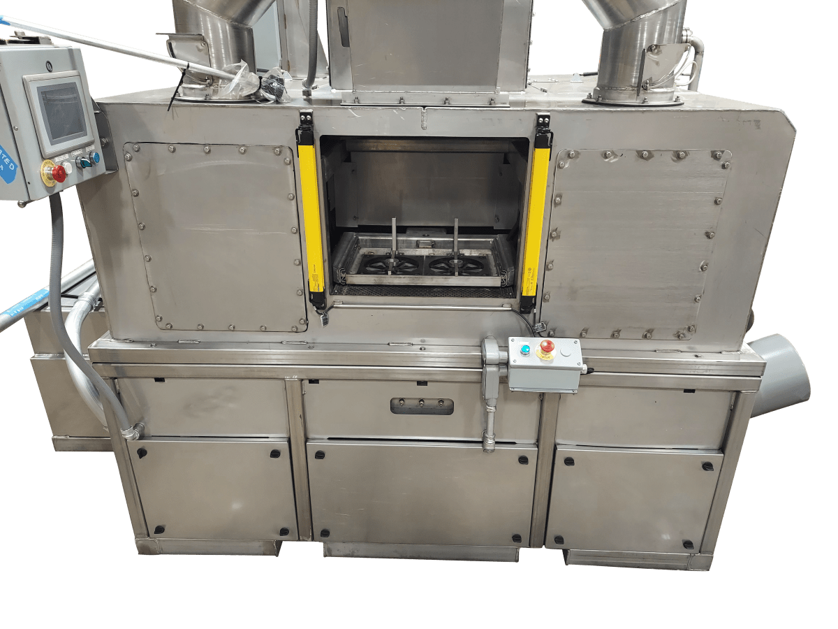 This application involves cleaning a wide range of hydraulic components, some of which have an inside bore which must be carefully cleaned by inserting a spray nozzle. This machine features a carousel design, where parts are loaded and then progress through a wash, rinse, and dry station before returning to the same station for unloading.