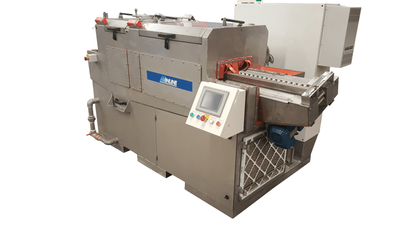 This washer was designed to fully clean and dry the entire outside diameter of ground cylinders. The parts enter the washer horizontally, and must be carried through the washer without changing orientation. The conveyor includes a variable tilt adjustment to keep the cylinders justified along one side of the conveyor so that nozzles can be directed inside the bores of parts with different diameters and lengths.